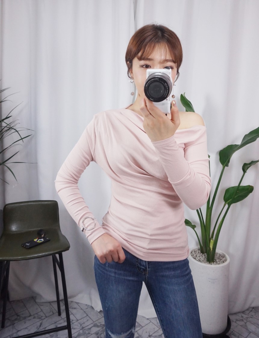 얇은 소재에 골지로 몸매를 더욱 슬림하게 보이도록 해주면서,스커트보다는 팬츠와 착용하였을 때라인이 더 예쁘게 잡히는 티셔츠에요:)