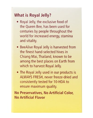 -. Binding : Health and Beauty -. Brand : BeeAlive -. EAN : 0898539002394 -. Feature : BeeAlive's most popular product for over 25 years for maintaining the everyday benefits of Royal Jelly now NEW and IMPROVED!!! / Premium fresh, never freeze-dried royal jelly in a plant-based vegetarian capsule / Just one Feel Good capsule a day can naturally boost your energy levels so that you begin living a more energized life!* -. Label : BeeAlive -. Manufacturer : BeeAlive -. MPN : JV0001 -. NumberOfItems : 1 -. PackageQuantity : 1 -. PartNumber : JV0001 -. ProductGroup : Health and Beauty -. ProductTypeName : HEALTH_PERSONAL_CARE -. Publisher : BeeAlive -. Studio : BeeAlive -. Title : BeeAlive Energy Formula Royal Jelly, 30 Gluten-Free Vegetarian Capsules -. UPC : 898539002394