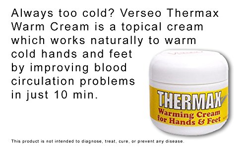 Potent Warming Pain Relief Cream with Natural Skin Care Blend. Verseo Thermax Warming Cream is a topical cream which works naturally to warm cold hands and feet by improving blood circulation. Made only of natural ingredients that are easily absorbed into the skin, this topical cream delivers Fast Relief in Just 10 Minutes.