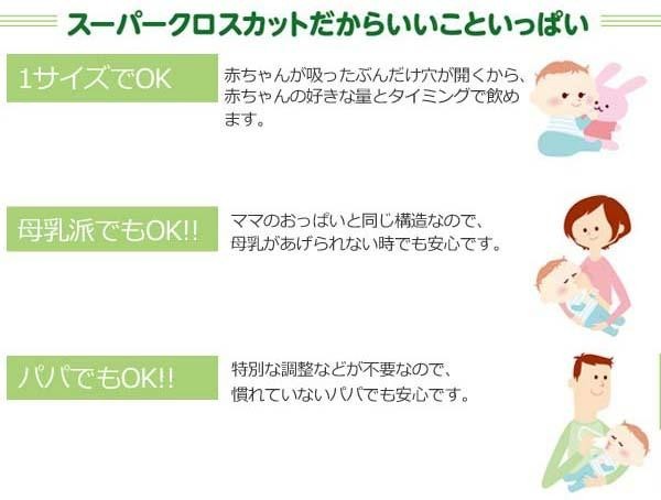 汚れやニオイが付きにくく、お手入れが楽な耐熱ガラス製哺乳びんです。チュチュベビーの乳首は「ママのおっぱい」がお手本♪ママのおっぱいのように「赤ちゃんが吸った分だけ」ミルクが出るようになっていますので、S・M・Lのサイズを月齢に応じて変える必要がありません。空気弁の調節が不要なスーパークロスカットの乳首です。 |