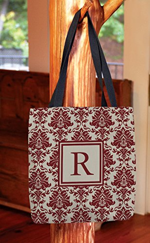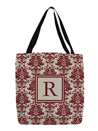 Manual Woodworkers & Weavers Shopping Tote Bag, 18-Inch, Monogrammed Letter R, Crimson Damask