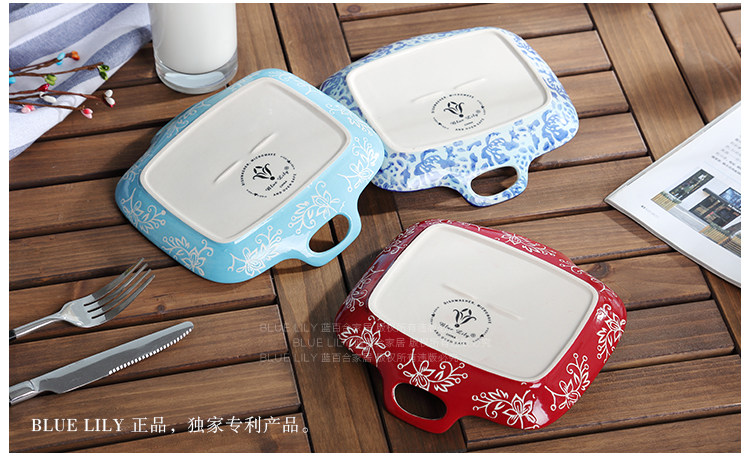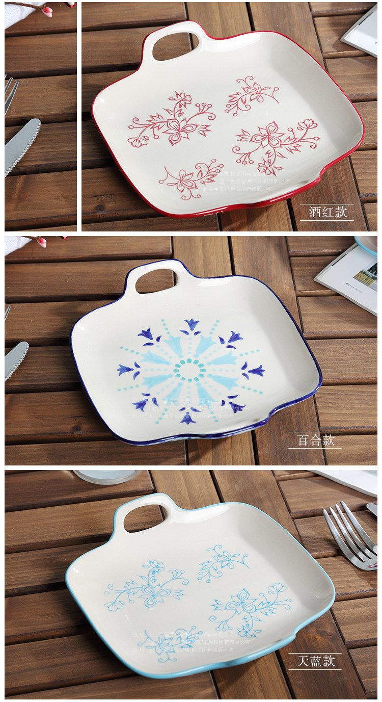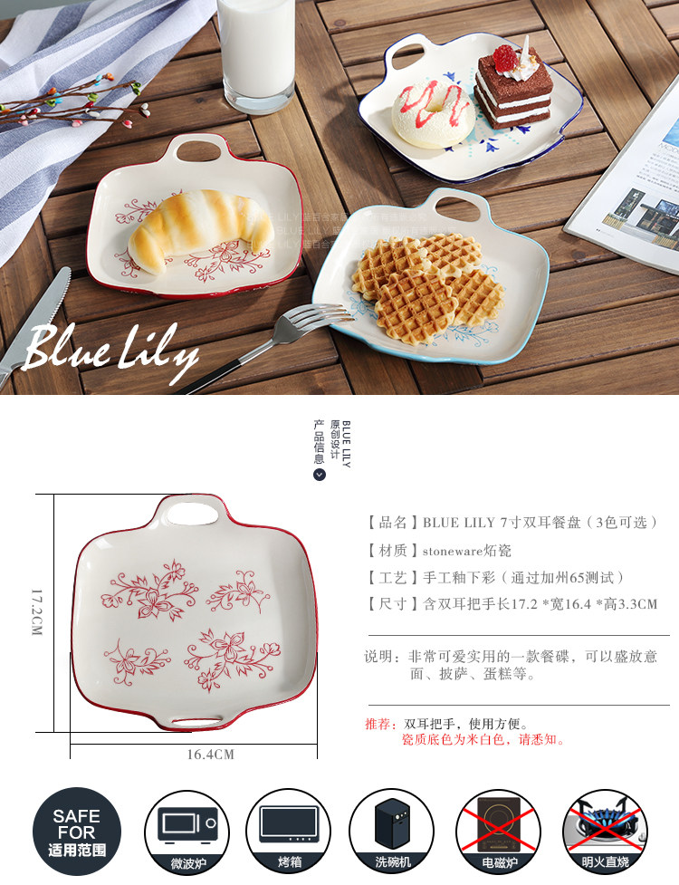 陶瓷餐具手工釉下彩 小清新陶瓷盘子 冷菜盘调味碟 7英寸双耳餐盘
