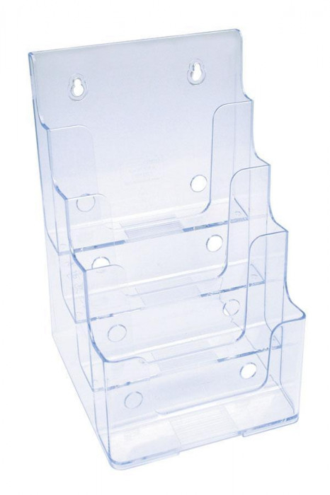 | インジェクション一体成型なのでデザインが美しく丈夫。各種パンフレットやチラシ・カタログなどの展示保管に最適です。背面にフック用の穴があるので壁掛け用としてもご利用できます。 |