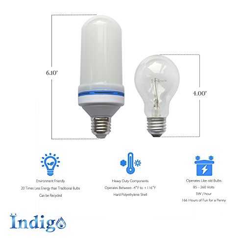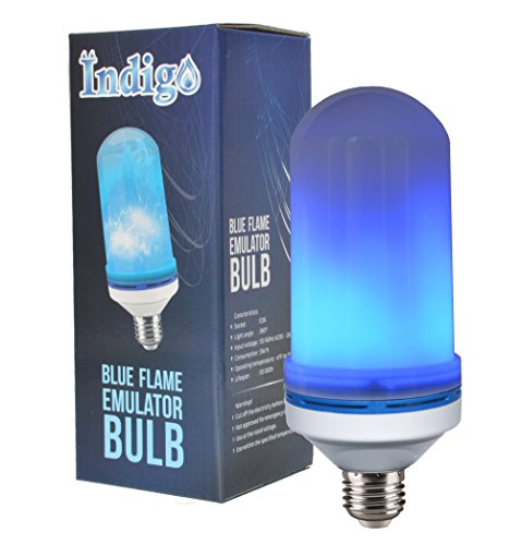 - CHARACTERISTICS: Indigo flame light bulb is compliant with all North-American E26 socket. They are tough and can withstand temperatures between -4°F and 118°F. They are energy efficient and will give you 166 hours of fun before they cost you a penny.