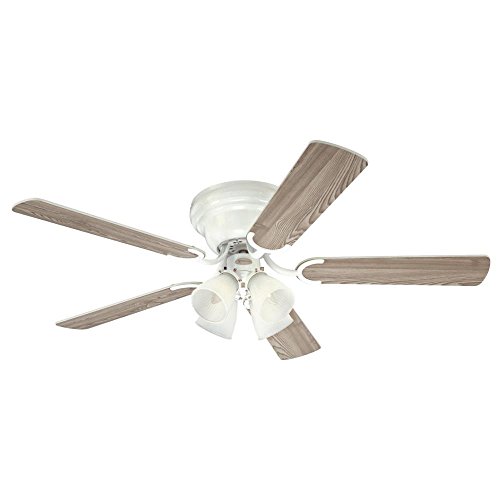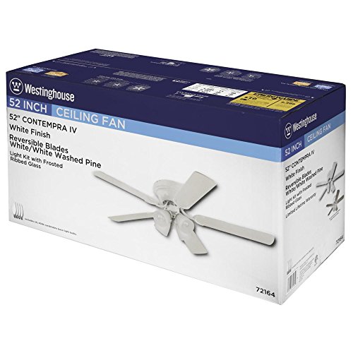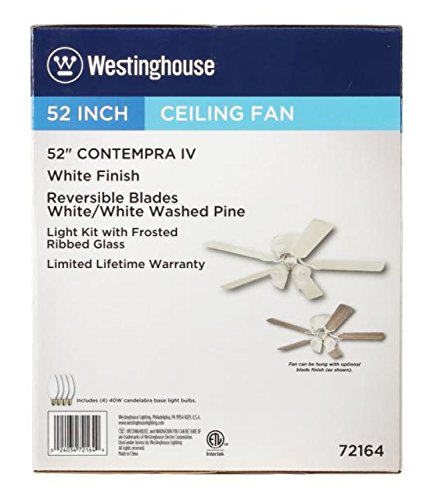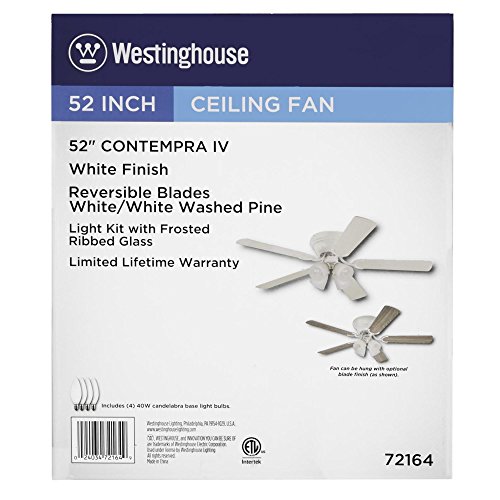 Enjoy distinguished style and year-round comfort with the Contempra IV indoor Fan. The white finish provides a clean look. Reversible blades in complementary finishes give you options for matching your room's decor. Choose from white or white washed pine finish blades. The light kit features four frosted glass shades that provide generous lighting. The fan's hugger mount style is perfect for large rooms with low ceilings. This Fan includes four candelabra base, 40-watt torpedo light bulbs. This Westinghouse ceiling Fan is backed by a lifetime motor warranty and a two-year warranty on all other parts. Westinghouse is a trusted, global brand. Westinghouse knows lighting and offers products with exceptional quality, reliability and functionality. Product reference number 72164.Feature
