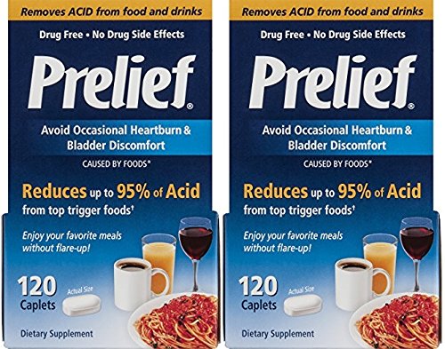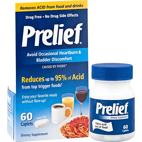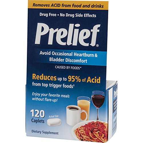 Contains (1) bottle of (120) caplets Prelief Acid Reducer, dietary supplement. Prelief works on high acidity foods or drinks to reduce the acidity up to 95%, decreasing digestive discomfort and bladder discomfort caused by overly acidic food and drinks.