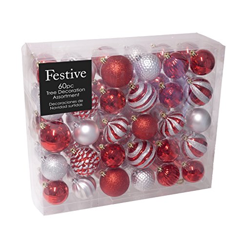 Festive 60 Piece Ball Christmas Ornament Set, Red & Silver
