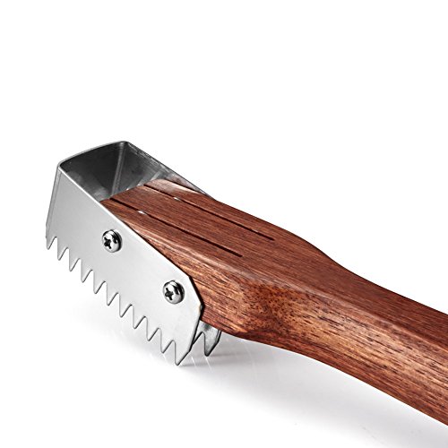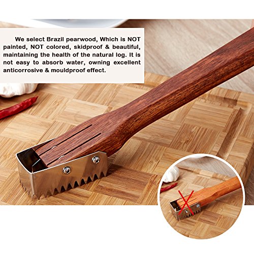 EXTENDED WOOD HANDLE: We select Brazil pearwood, Which is NOT painted, NOT colored, skidproof & beautiful, maintaining the health of the natural log. It is not easy to absorb water, owning excellent anticorrosive & mouldproof effect. Easy to grasp design is convenient to grip, you can use it easily and safely to get rid of fish scale. Coming with small hole for hanging it on your kitchen wall.
