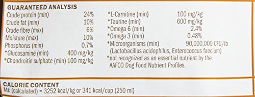 素材構成:粗蛋白質(最低) 24%、粗脂質(最低) 10%、粗繊維質(最高) 6%、水分(最高) 10%、リン(最低) 0.7%、グルコサミン(最低) 400mg/kg、コンドロイチン(最低) 100mg/kg、Lカルチニン(最低) 100mg/kg、タウリン(最低) 600mg/kg、オメガ6(最低) 2.4%、オメガ3(最低) 0.48%