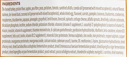 原材料:骨抜き七面鳥、ジャガイモ粉、リンゴ、豆繊維、豆、ジャガイモ、トマト、天日干しアルファルファ、キャノーラ油、天然香味料、鮭、骨抜き鴨肉、ココナツオイル、乾燥卵、アマニ、ニンジン、カボチャ、バナナ、ブルーベリー、クランベリー、ラズベリー、ブラックベリー、パパイヤ、パイナップル、グレープフルーツ、レンズ豆、ブロッコリー、ホウレンソウ、カッテージチーズ、発芽アルファルファ、乾燥ケルプ、炭酸カルシウム、第二リン酸カルシウム、レシチン、塩化ナトリウム、塩化カリウム、ビタミンEサプリメント、L-アスコルビン酸