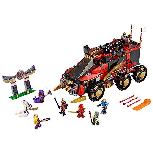 -. Feature : Enthält 6 Minifiguren mit Ausrüstung und Zubehör: Kai, Nya, Garmadon, Pythor, Kapau und Chop'rai. / Die mobile Ninja-Basis verfügt über ein aufklappbares Doppelcockpit, zu bauende große Räder, Ninja-Verzierungen, riesige Goldklingenverzierungen, 2 Flaggen, verborgene federunterstützte Doppel-Shooter, umklappbare Spoiler sowie über eine abtrennbare Kommandozentrale mit Steuerkonsolen, Waffenständer, Ausrüstungsständer, Werkstattbereich für Kais Motorrad und Wachturm mit Nyas abtrennbarem Flieger samt Doppel-Shooter. / Ebenfalls enthalten: Anacondrai-Tor / Auch ein Miniroboter ist vorhanden. / Ausrüstung: Kais 2 Schwerter, Nyas 2 Schwerter, Pythors Anacondrai-Schwert, Kapaus Anacondrai-Klinge, Chop'rais Fangzahn-Klingenhammer sowie Garmadons Stab.