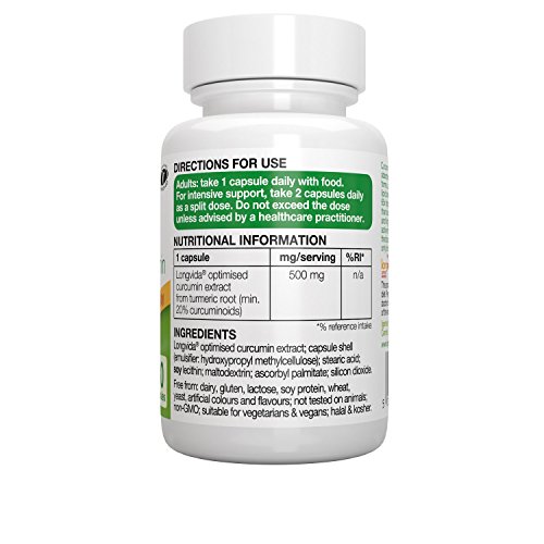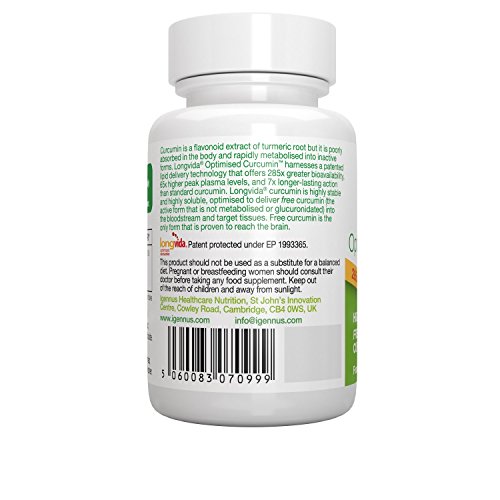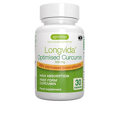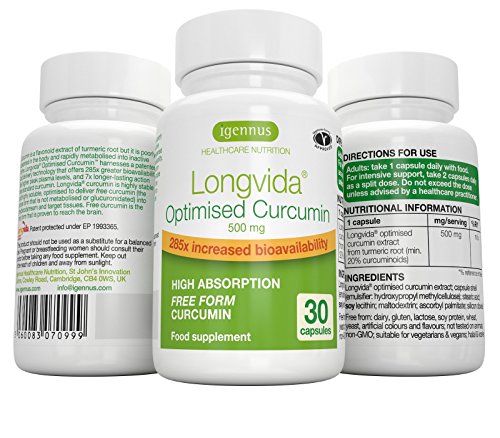 -. Binding : Health and Beauty -. Brand : Igennus Healthcare Nutrition -. EAN : 5060083070999 -. Feature : LONGVIDA HIGH ABSORPTION FORMULA DELIVERS FREE FORM CURCUMIN: Longvida is the only delivery system proven to deliver free form curcumin into the bloodstream and target tissues / 285x GREATER BIOAVAILABILITY and 7x LONGER-LASTING ACTION than standard curcumin / EFFECTIVE HIGH DOSE IN A SINGLE CAPSULE - 500MG DOSE ACHIEVES CLINICALLY ACTIVE PLASMA LEVELS / CONSISTENT PRODUCT QUALITY GUARANTEED: GMP manufactured - quality standards that medicines manufacturers must meet in their production processes to ensure products are of consistent high quality / SUITABLE FOR VEGETARIANS & VEGANS and for halal and kosher diets -. IsAdultProduct : 0 -. Label : Igennus Healthcare Nutrition -. Manufacturer : Igennus Healthcare Nutrition -. Model : SKU179 -. MPN : SKU179 -. PackageQuantity : 1 -. PartNumber : SKU179 -. ProductGroup : Health and Beauty -. ProductTypeName : HEALTH_PERSONAL_CARE -. Publisher : Igennus Healthcare Nutrition -. Studio : Igennus Healthcare Nutrition -. Title : Longvida Optimised Curcumin 500 mg - 285x more bioavailable - 30 capsules/1 month supply