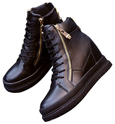 -. Feature : 大人おしゃれな厚底ハイカットスニーカーです。4cmのインヒールが抜群の美脚効果をもたらします。ボリュームがあるので足首も細くスリムに見えるところも嬉しいポイント。地面からのヒールの高さは約7.5cmありますがインヒールは4cmなので足への負担も少なく長時間履いても疲れにくいためダンスの衣装にも適しています。 / 黒×ゴールドののコントラストがかっこいいデザイン。両サイドとかかとの3点ジップアップが靴を履きやすくします。デイリーユースにもぴったり。どんなスタイルにも合わせやすいのでヘビロテ間違いなしの使いやすさです。 / 素材は上質でやわらかなフェイクレザー。水やホコリをはじきやすいのでさっと拭くだけでお手入れが簡単。靴底は深い凸凹で滑りにくい形状で滑りにくいため小雨の時などにとても便利。(※レインシューズではありません。)幅広の作りで足に馴染みやすく快適な履き心地。 / 【サイズ】35/22.5cm 36/23.0cm 37/23.5cm 38/24.0cm 39/24.5cm 40/25.0cm 【カラー】ブラック / 外見ソール3.5cm、インソール4.0cm、全高16cm / 【素材】フェイクレザーPU 【重さ】片足:370g