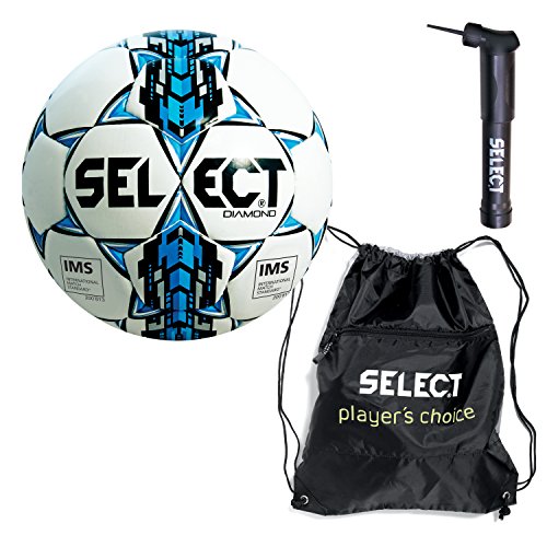 -. Feature : Select Sports' highly-rated soccer ball, the Diamond, now available in a pack that includes: One size 5 soccer ball, sack pack and a soccer ball hand pump / Made with a very strong and durable TPU cover with a specially constructed underlining of 2mm TPE foam and a patented zero-wing bladder / The 32-panel hand sewn technology ensures an optimal and true flight for this ball. Includes a 2-year Warranty / Includes: Select Sport sack pack(Features: front pocket with zipper and is great for carrying small soccer necessities or a soccer ball) and a soccer ball hand pump that guarantees quick inflation with excellent air flow / Ball ships deflated