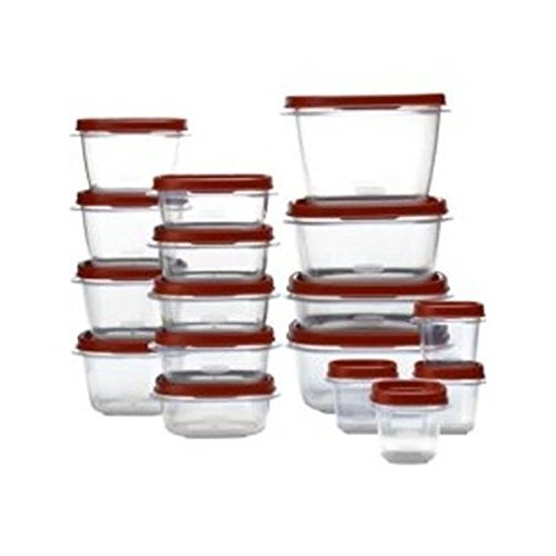-. Brand : Rubbermaid -. Color : Red, Clear -. Feature : Lids snap together and to container bases so you can always find the right lid / Graduated sized containers nest for compact storage / Microwave, freezer and dishwasher safe / Thick, durable container walls for everyday use / Bases and lids are BPA- free -. ProductGroup : Kitchen -. ProductTypeName : KITCHEN -. Title : 34 Pc Easy Find Lids Set By Rubbermaid