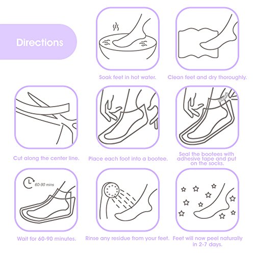 1. Soak your feet in warm water before use and then dry thoroughly. 2. Cut along the center line of the bootee and separate into two pieces. Place your foot inside one of the pieces and seal it with adhesive tape. 3. Wear the bonus sock on top of the bootee to ensure the foot peeling mask is in full contact with your foot. Repeat with the other foot. 4. After 60-90 minutes, remove the mask and rinse the residue off your feet. Peeling usually begins within 2-7 days (results vary between individuals).