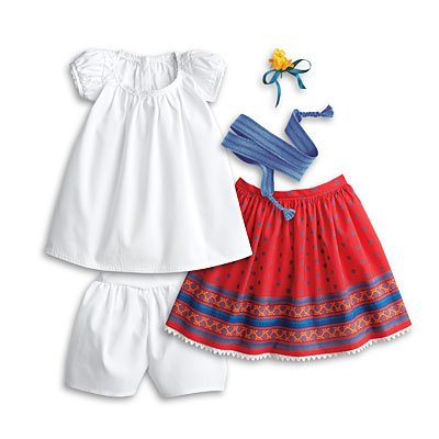 [Description] Gentle Josefina Montoya has warm brown eyes that open and close_ golden hoop earrings_ and long_ shiny mahogany-colored hair. She comes in an authentic 1824 outfit: A white camisa edged with lace. A colorful border-print skirt. A blue woven belt. White drawers. Faux-leather moccasins. A little sprig of yellow primroses tied with a blue ribbon in her hair. The 18`` Josefina doll has a huggable cloth body_ and her movable head and limbs are made of smooth vinyl. Includes the paperback book.