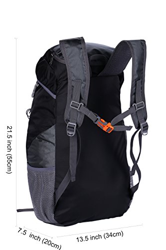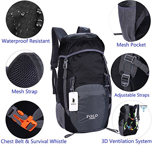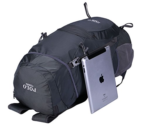 -. Feature : ROOMY CAPACITY: Larger than other packable backpack! 42L! Large enough to carry what you need in the trip,It's roomy enough for your hammock, clothes,towel, journal,and a couple beers if needed,etc / HANDY AND LIGHTWEIGHT: It fits into an ultra-compact pouch. Easy to folds up into small pocket. So you can easily pack it in your suitcase, purse or car and have an extra bag without it taking up.Avoid overweight charges, simply unfold from your lage and use it as a carry on for your excess baggage. / DURABLE & WATER RESISTANT : The backpack is made from High Quality Water and Tear Resistant Nylon fabric, provide strengthen and long-lasting performance with minimal weight; Adjustable and breathable mesh shoulder and strap to meet different requirements for both men and women / SIZE:Unfold size: 23.6x 13.8 x10 (H x W x D), Folds into: 8.5"x 7.5" x 1.5"inches (H x W x D) . Capacity: 42 Liters. Weight: 12 ounces.1 Main Compartment with Drawstring Closure, 2 Top Pouch (Interior & Exterior), 1 Interior Open Pocket , 1 Front Spandex Pouch, 2 Sports Bottle Holder, and Padded Backpack Strap with Whistle Chest Clip / VERSATILE: Ultra-light, Ultra-durable, Ultra-awesome daypack.Perfect for hiking,occasional travel,day-to-day use,pack beach accessories, suitcase alternative, storing diapers,college, camera compartment, camping and more.POLO quality guarantee.Great gift for everyone
