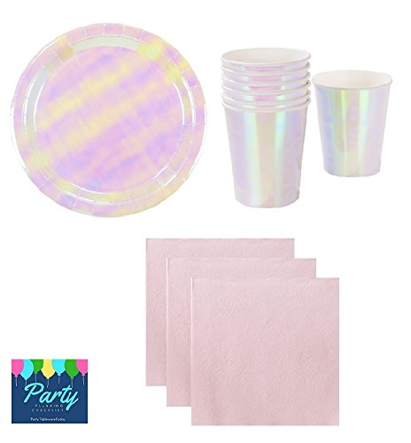 -. Feature : Beautiful Iridescent Disposable Party Supply Pack for 12 Guests / 12 - Large Paper Iridescent Dinner or Luncheon Plates (9") / 12 - Matching Iridescent Hot/Cold Paper Cups (9 oz.) / 20 - Luxury Embossed Matching Pink Napkins (3-ply) / You will also receive a "Party Planning Checklist" PDF to help plan your party.