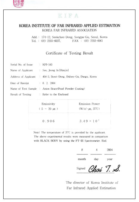 检测证书: 专利厅使用新发明 申请第0034889号 检测机构: 韩国远红外线应用评价研究院/韩国产业技术试验院