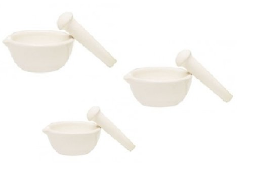 -. Feature : Combination of our 3 most popular sizes of white mortars and pestles for little to big jobs! / Small has a 100mm diameter (4) with a volume of 175mL or 6oz. / Medium is 130 mm (5) with a volume of 350mL or 12oz. / Large is 160mm (6) with a volume of 500mL or 16oz.