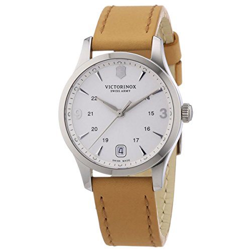 Stainless steel case with a beige leather strap. Fixed stainless steel bezel. Silver dial with silver-tone hands and index hour markers. Arabic numeral marks the 3 and 9 o'clock positions. 24 hour markers. Minute markers around the outer rim. Dial Type: Analog. Date display at the 6 o'clock position. Quartz movement. Scratch resistant sapphire crystal. Pull / push crown. Solid case back. Case diameter: 30 mm. Round case shape. Band width: 21 mm. Tang clasp. Water resistant at 30 meters / 100 feet. Functions: date, hour, minute, second. Casual watch style. Victorinox Swiss Army Alliance Silver Dial Beige Leather Ladies Watch 241541.Feature
