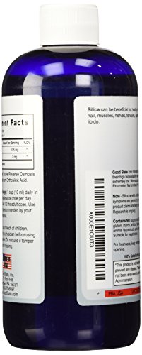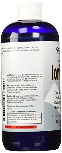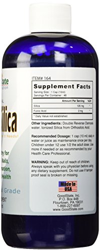 -. Binding : Health and Beauty -. Brand : Good State -. EAN : 0857515003404 -. Feature : Contains 125 mg of Elemental Silica / Nano Sized Ionic Silica / High Absorbtion / Made in the USA -. Label : Good State -. Manufacturer : Good State -. Model : 164 -. MPN : 164 -. NumberOfItems : 1 -. PackageQuantity : 1 -. PartNumber : 164 -. ProductGroup : Health and Beauty -. ProductTypeName : HEALTH_PERSONAL_CARE -. PublicationDate : 2014-10-02 -. Publisher : Good State -. Studio : Good State -. Title : Good State Liquid Ionic Silica Supplement, (48 servings at 125mg each plus 2 mg fulvic acid) -. UPC : 857515003404
