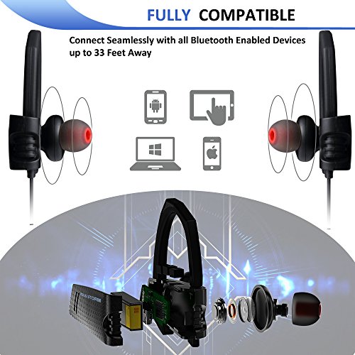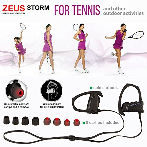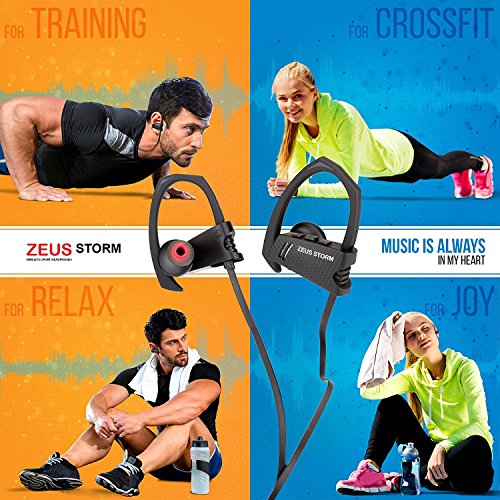 -. Feature : WORKOUT SPORTS HEADPHONES: Workout wireless earbuds the best for running headphones. Water resistance rating - IPx5 (sweatproof headphones against rain and splashes from any directions). Fits for yoga, exercises, hiking, gym, fitness, travelling / STEREO BLUETOOTH HEADSET and NOISE ISOLATION HEADPHONES: Wireless headphones have incredible sound quality with extra bass, soaring highs and clear midrange. Noise cancelling microphone with CVC 6.0 technology reduces outside noise and offers strong signal. Bluetooth earbuds with mic and volume control. / UP TO 7 HOURS OF MUSIC: Zeus Storm sport headphones in ear provide up to 7 true hours of play time on a full charge at average volume and 200 hours at stand-by mode. Powerful polymer battery (95mAH) takes just up to 2 hours to charge your Bluetooth headset fully. GET 100% SATISFACTION or get a refund/replace! 30 days no questions asked return policy and a ONE-YEAR WARRANTY - your purchase is totally RISK-FREE! / BLUETOOTH WORKOUT EARBUDS and UNIVERSAL CONNECTIVITY: Bluetooth V4.1 technology allows easily to pair your sport earphones to iPhone, iPad, Samsung, Nexus and other Android phones, Windows phones up to 10 meters (33 feet). Multi-points connection: the wireless earbuds can pair two Bluetooth devices at the same time. / Be Sure to buy Bluetooth headphones Zeus Storm NOW!