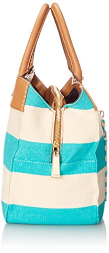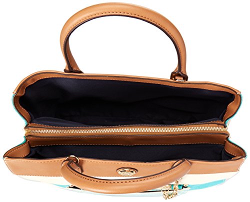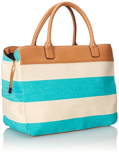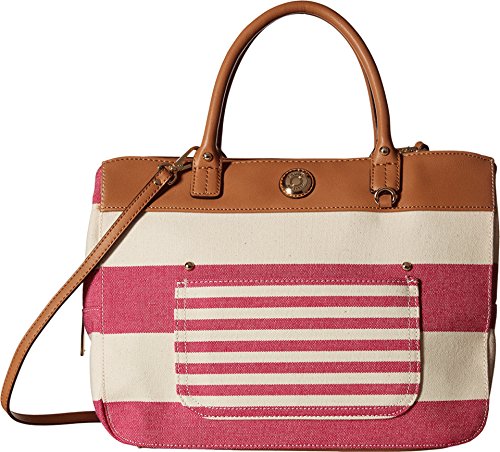 Dual rolled carry handles. Removable and adjustable crossbody strap. Top zip closure. Exterior features cute stripe print, signature brand medallion and slip pocket at front, and large slip pockets at front and back. Flat base. Lined interior features back wall zip pocket and additional slip pocket for organization. Imported.
