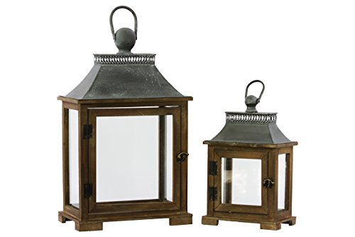 Urban Trends Wood Lantern with Metal Top and Ring Handle, Dark Stained Wood Finish, Set of 2