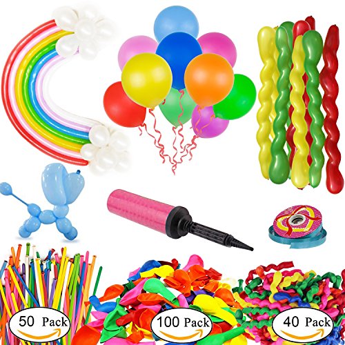 192 Pieces Party Balloons, Rainbow Color Latex Strip Shape Magic Animals Balloons,3 Style, With Hand Held Air Inflator, And a Roll Of Ribbons For Party Decoratons, Children Gift(3 Stytles)