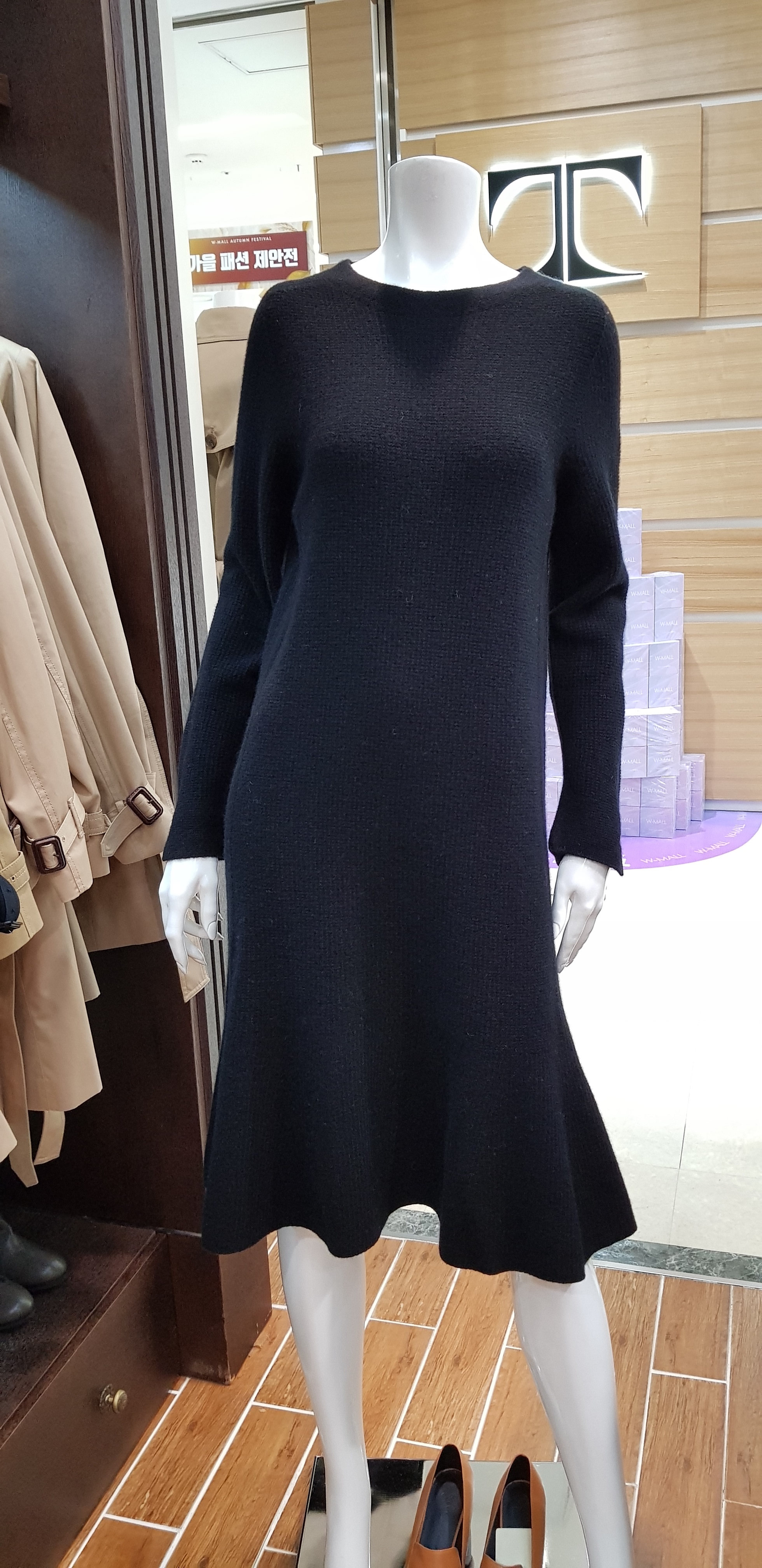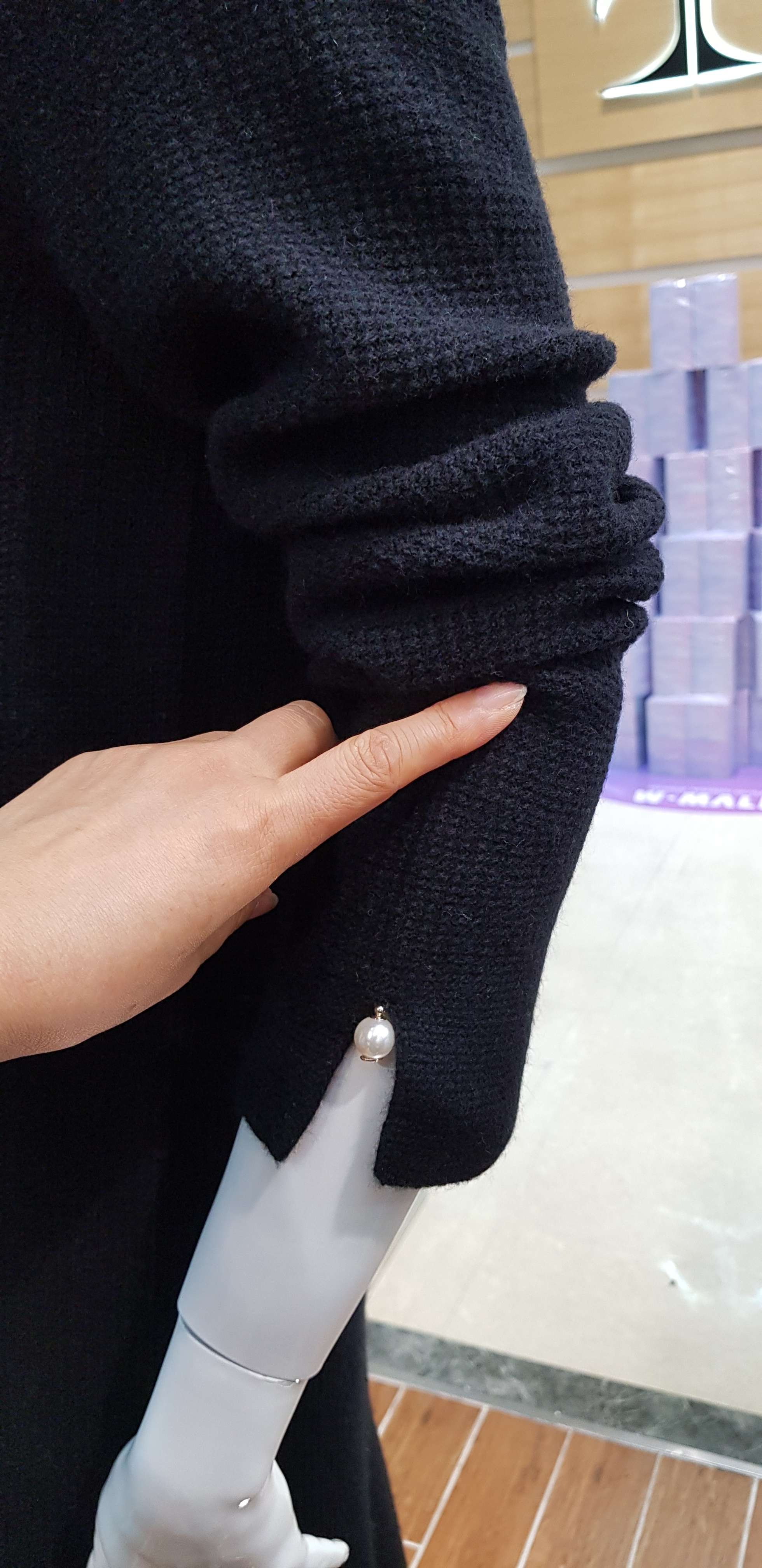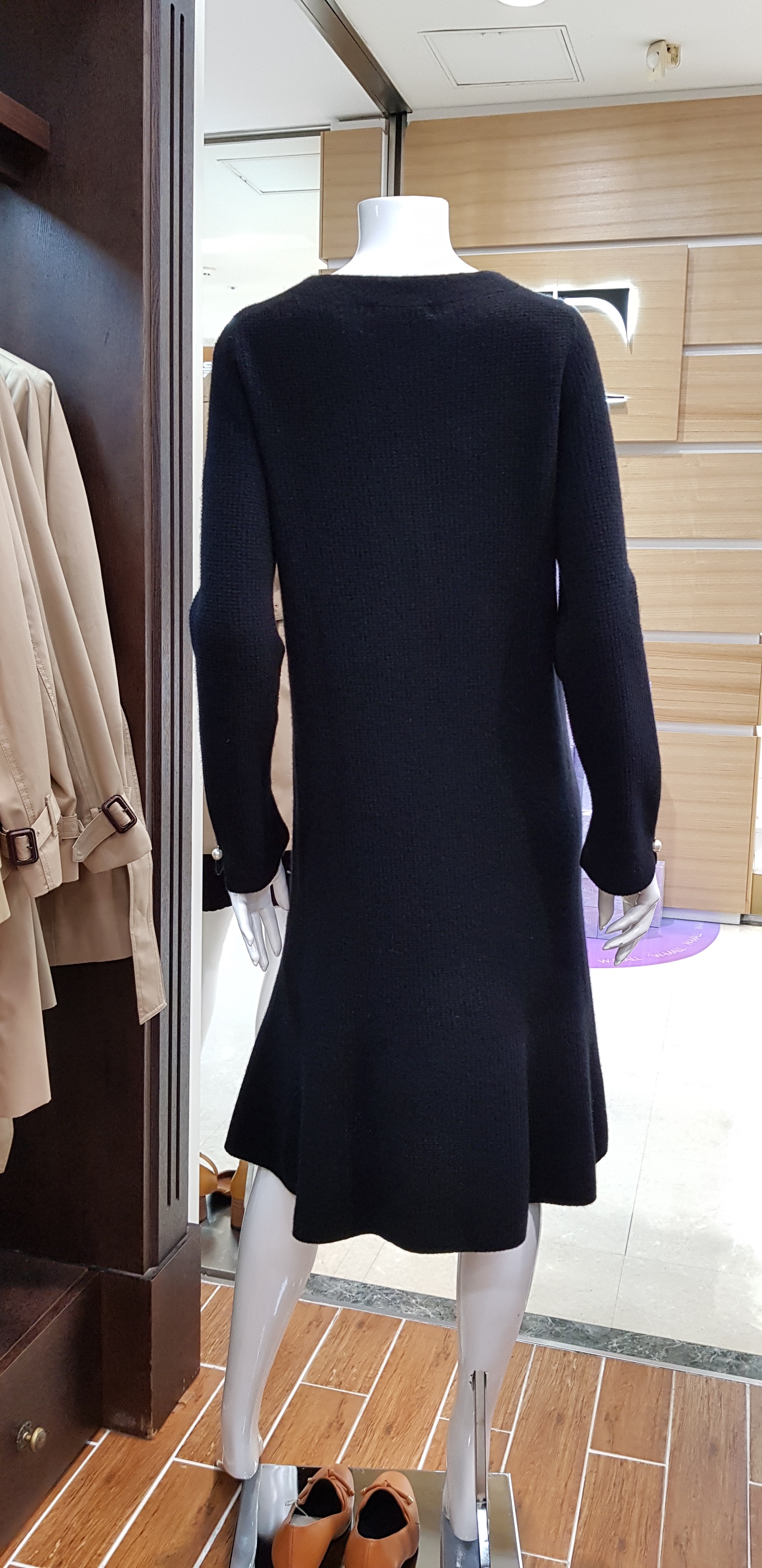 키이스~울과 캐시미어 소재의 가볍고 따뜻한 원피스입니다 소매끝의 진주장식이 포인트로 고급스런 분위기이고 스커트 아랜단의 프릴느킴이 사랑스런 니트원피스입니다 총장100센티입니다