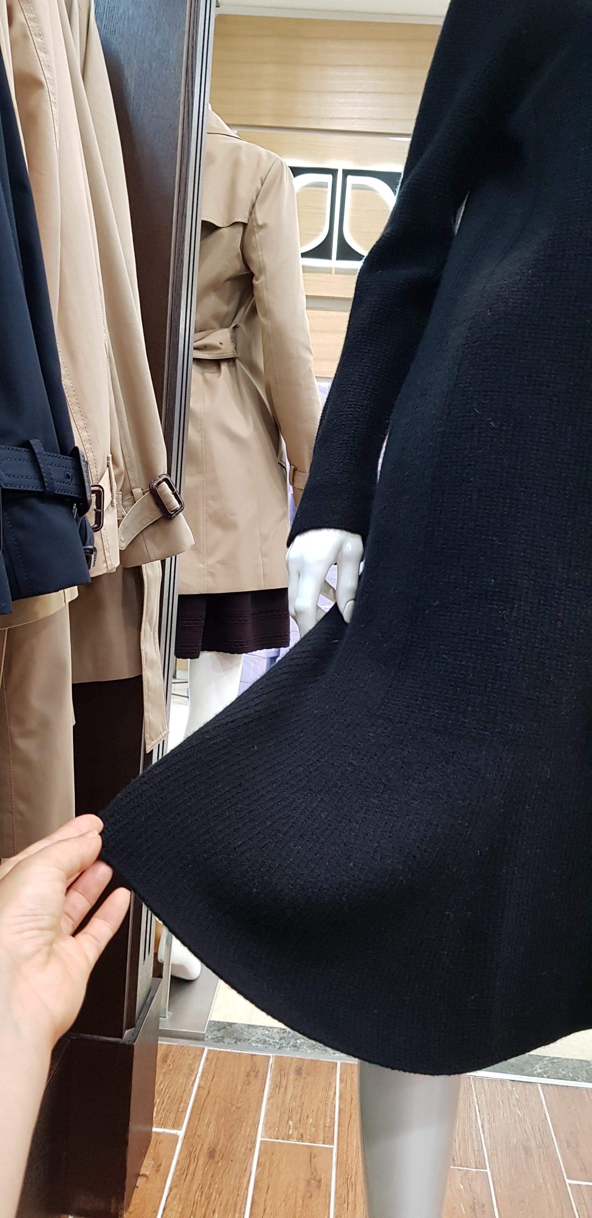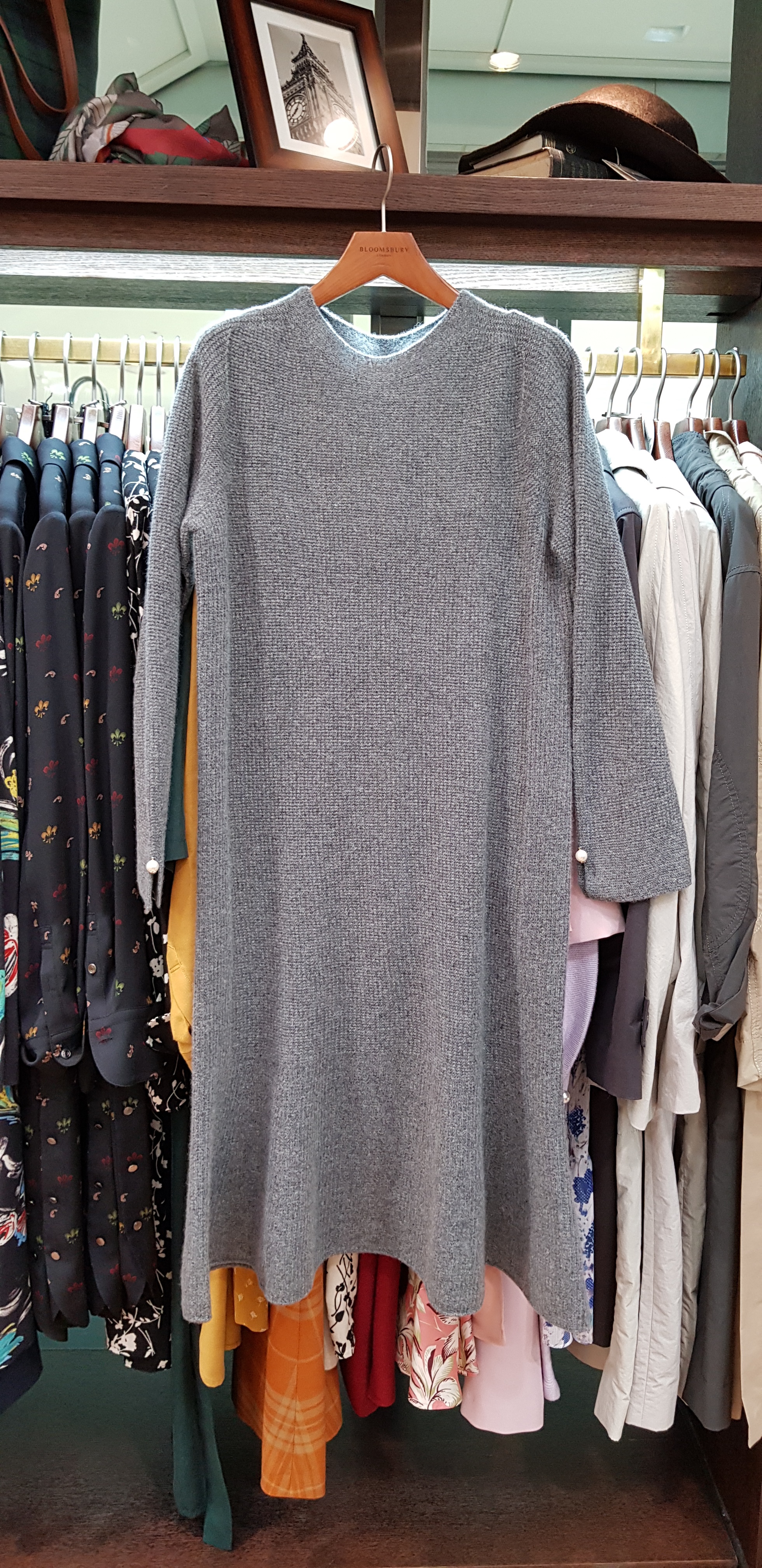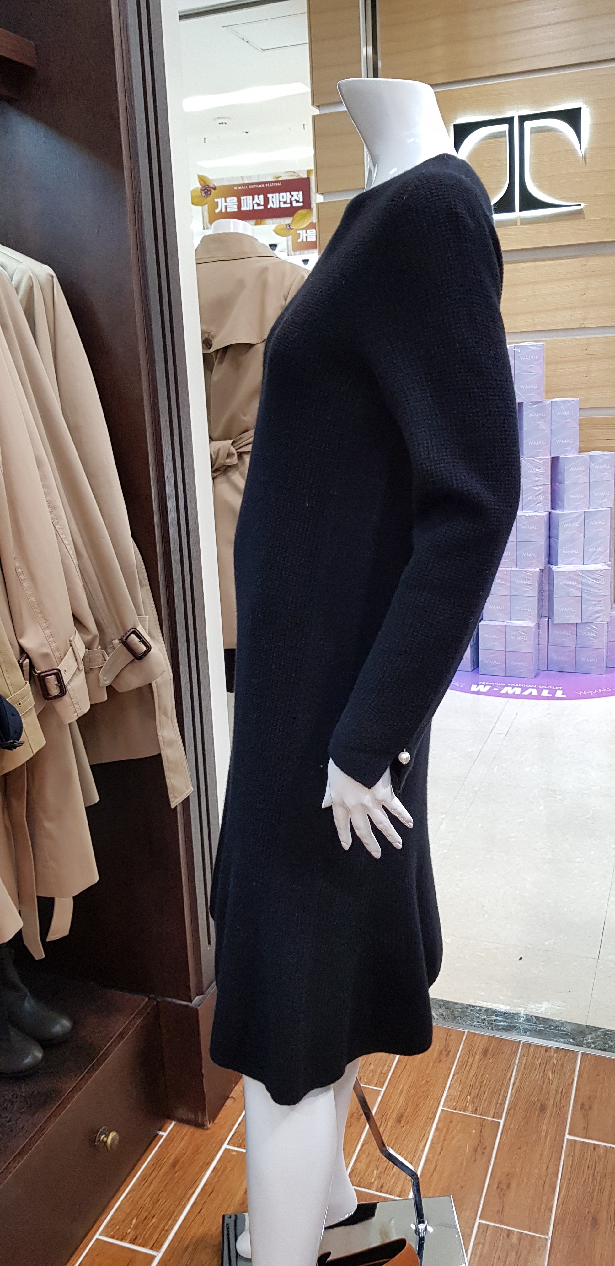 키이스~울과 캐시미어 소재의 가볍고 따뜻한 원피스입니다 소매끝의 진주장식이 포인트로 고급스런 분위기이고 스커트 아랜단의 프릴느킴이 사랑스런 니트원피스입니다 총장100센티입니다