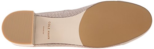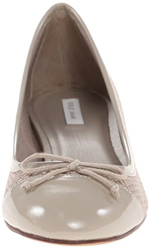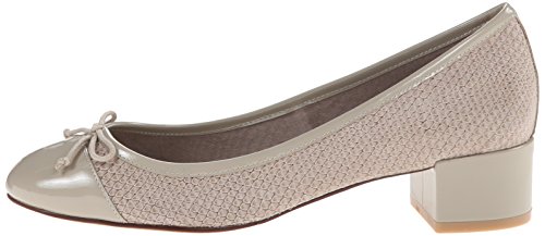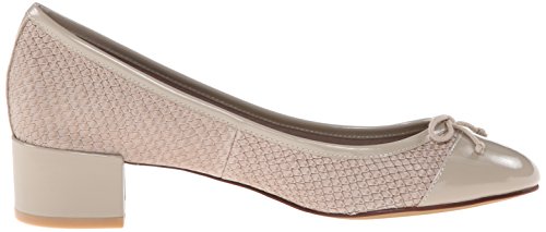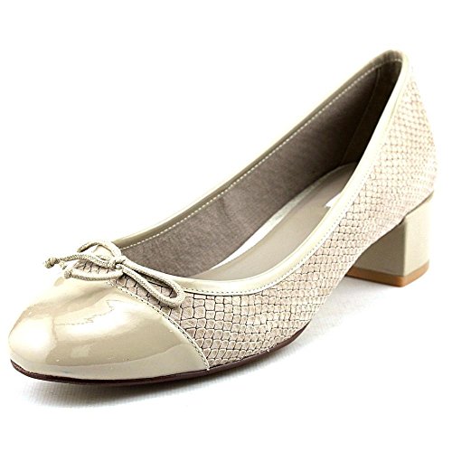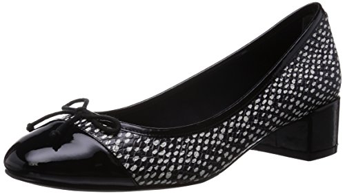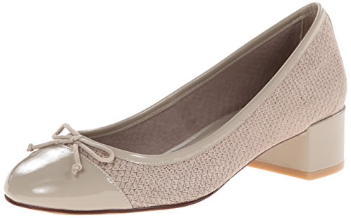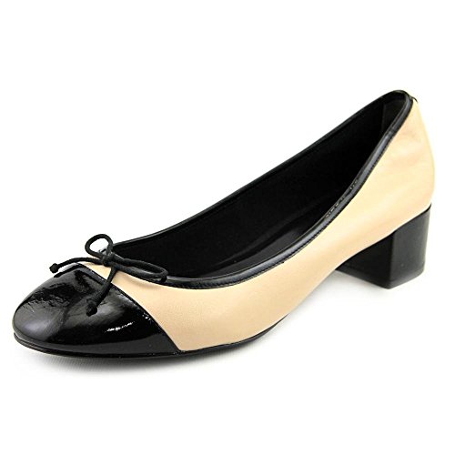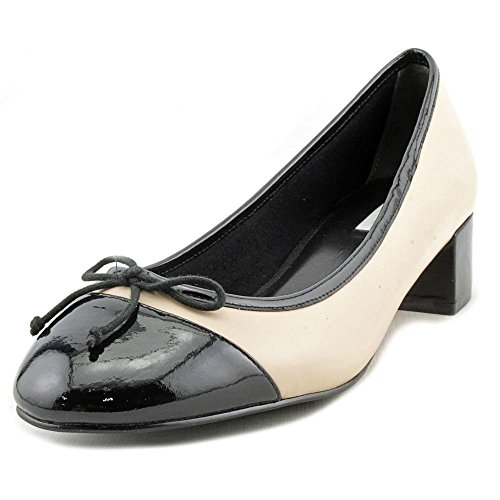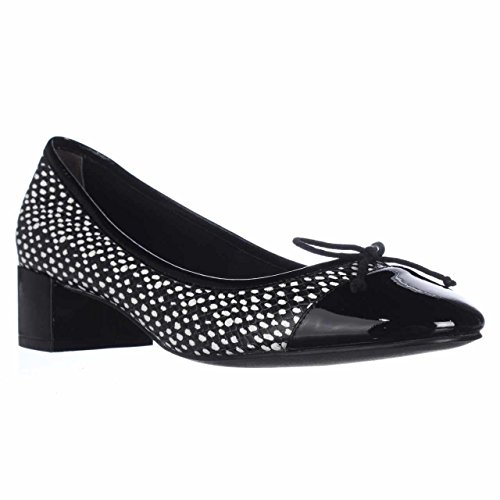Block-heel pump featuring decorative bow and patent leather topline and toe