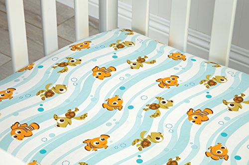 ReleaseDate : 2017-05-04 Studio : Crown Crafts Inc Publisher : Crown Crafts Inc Binding : Baby Product Product Description All-over ocean wave print in soft aqua and white with Nemo and Squirt having fun riding the current. Vibrant colors of light blue, white, and orange. Fits a standard size crib mattress 28" x 52". Coordinates with Nemo nursery bedding. 0