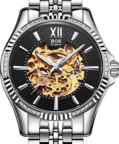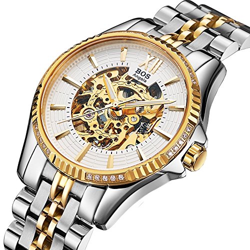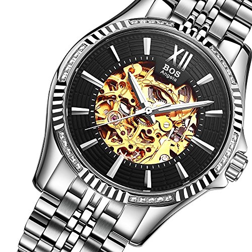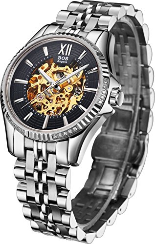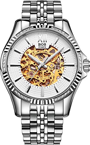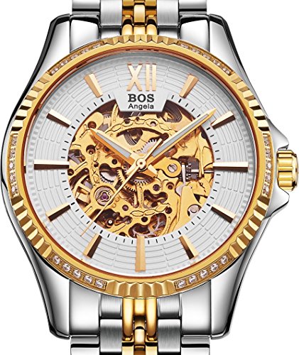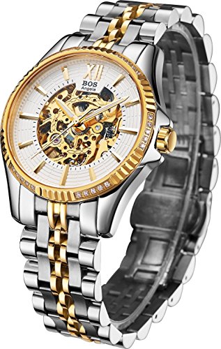 -. Title : BOS Men's Stainless Steel Gold Case White Dial Skeleton Mechanical Waterproof Wrist Watch 9010