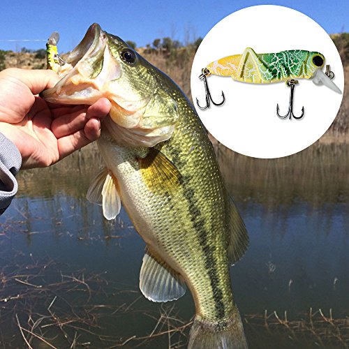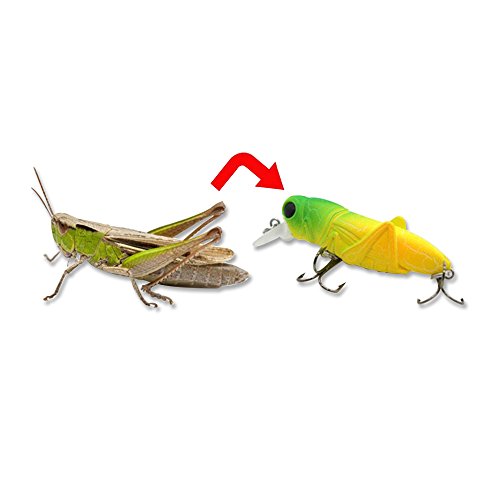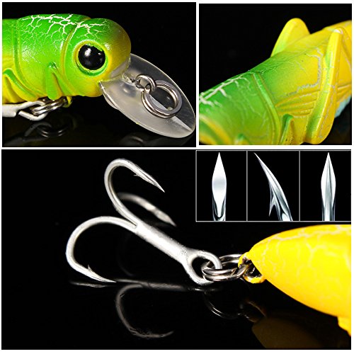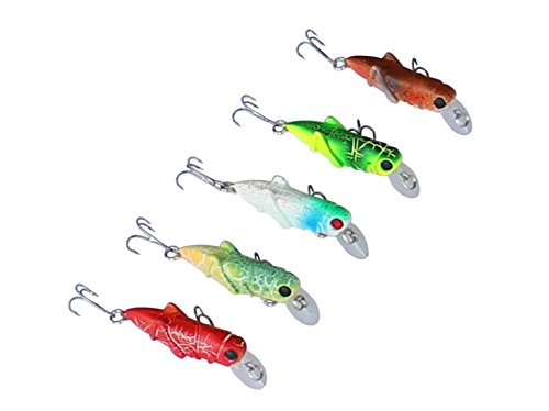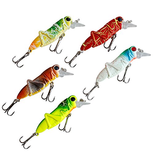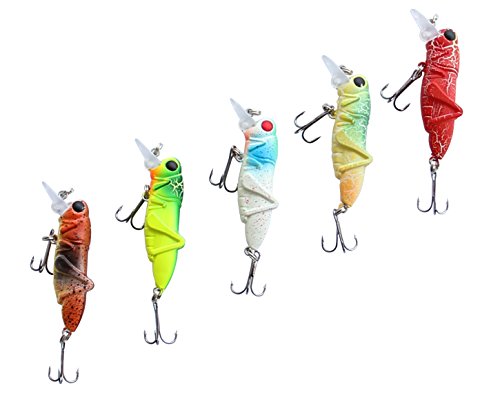 -. Feature : 5PCS FISHING LURES SET FOR BETTER CATCHES: 1pcs suspending luminous lure(the one with white body and red eyes) ,4pcs floating lures,different colors for various needs / LIFE-LIKE DESIGH: 2.2in/pcs;0.11oz/pcs,like the real locust insects.Rigged with 2 treble sharp hooks, 3D eyes, super loud rattle chambers when you tug your rod it pushes the surface water creating disturbance and sound to attract fish / GREAT ACTION: Practices can mimic insects strling in the water at the action caused the appetite of the fish bait attack / WILDELY USED FOR FRESHWATER FISH: Ideal for bass,perch,carp,mandarin fish, largemouth and other freshwater fish,wonderful tools for fishing lovers / CONVENIENT TO USE: All the fishing lures are in a free tackle box,convenient to take around and easy access