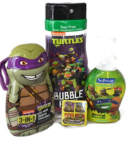 -. Title : Teenage Mutant Ninja Turtles Bathroom Bundle of 4 Items Include 24 Fl Oz Bubble Bath, 8.5 Fl Oz Hand Soap, 14 Fl Oz 3 in 1 Bodywash Shampoo & Conditioner 1 Magic Towel Washcloth (Donatello Purple, Purple-power Punch)