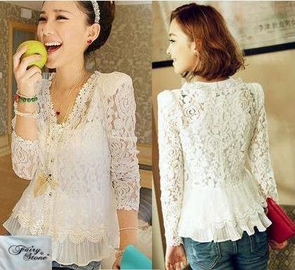 -. Title : Fairy Stone ブラウス シャツ レディース 花柄 レース Vネック おしゃれ かわいい きれいめ スリム カジュアル フォーマル ファッション ホワイト S M L XL オリジナルハンドタオルセット B-03