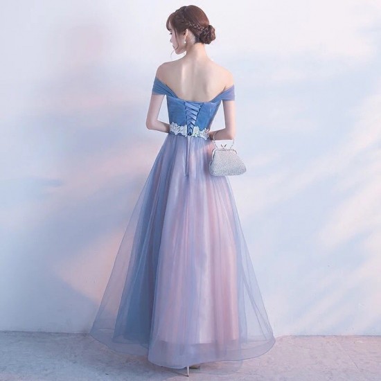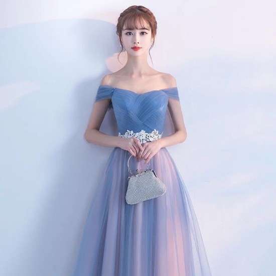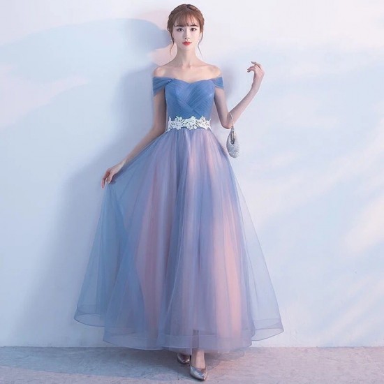 エアリーなチュールレースの、ロング丈オフショルダードレス。