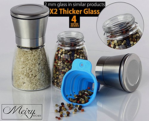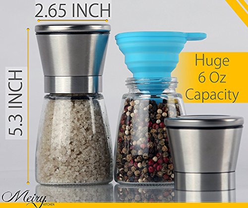 PACKAGE INCLUDES - Two elegant manual stainless steel mills with thick clear glass- Huge 6 Oz capacity! Classic stainless steel stand, blue folding silicone funnel for filling the spices with ease and an eBook with 12 great delicious recipes from our private chef.