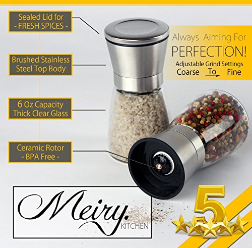 HIGH QUALITY GLASS AND STAINLESS STEEL GRINDERS- Two functional grinders with unique 4mm glass, grind the spices to the perfect size with the best adjustable ceramic rotor. WE GUARANTEE LONG-TERM USE!