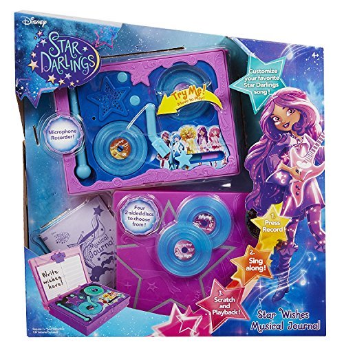 The Disney Star Darlings love to express themselves through unique, out-of-this-world music. With the Disney Star Darlings Musical Journal, girls can find their unique voice by writing & recording their own startastic music. With 4 dual-sided discs girls can choose from any of the hit Star Darlings band songs in both lyrical & instrumental tracks! Choose a song, sing-along using the real working microphone, press record & play it back to let your inner star shine bright. Journal also features a cool scratch pad to remix your songs and includes a notebook with song lyrics and blank pages to write your own songs! Make your wish of being a pop star come true with the help of Starland’s hit sparkle rock band! Ages 4+. Requires 3 AAA batteries included. Key Features: • Real working microphone! Become the lead singer of your very own band with the pop up microphone to record songs or secret messages! • 4 dual-sided discs! Choose from any of the Star Darlings hit songs – “Starlight”, “Up”, “Wish Now” & “I’m More”. Sing-along with the Star Darlings band using the lyrical side or cover your favorite song using the instrumental side! • Record & playback feature! Once you’re ready to become a true pop star like your favorite Star Darling, press record and let your friends & family hear it later! • Lyric notebook included! Learn the words to all four of the Star Darlings band songs or write your own lyrics!Feature