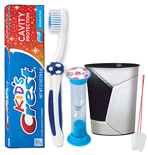 -. Feature : Make Your Child's Bedtime Rountine Something They Want To Do Verse Have To Do! Becuase When Brushing Is Fun, It Gets Done! / (1) SmileCare Youth Soccer Themed Soft Manual Toothbrush! (Assorted Colors) / (1) Crest Kids Cavity Protection Sparkle Fun Toothpaste, 2.7-oz. Tube / (1) Dentist Recommended 2 Minute Soccer Themed Brushing Timer (Assorted Characters) (1) Socer Ball Plastic 16oz Mouthwash Rinse Cup! Double As Toothbrush Holder! / Plus Bonus "Remember to Brush" Visual Aid Tooth Saver Necklace. Hang it in their bathroom or by their bed so they remember to keep their chompers sparkly fresh. You could also use these tooth charms to save one of your child's baby teeth.