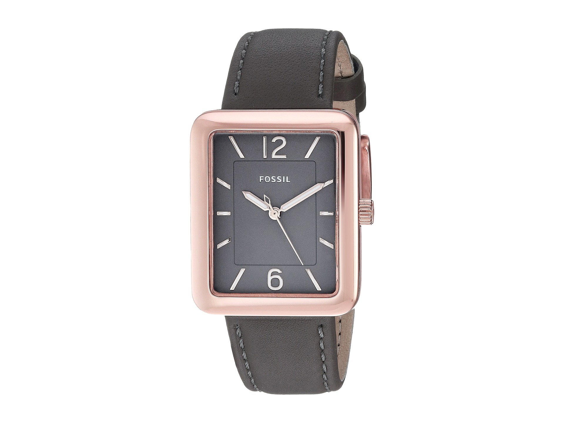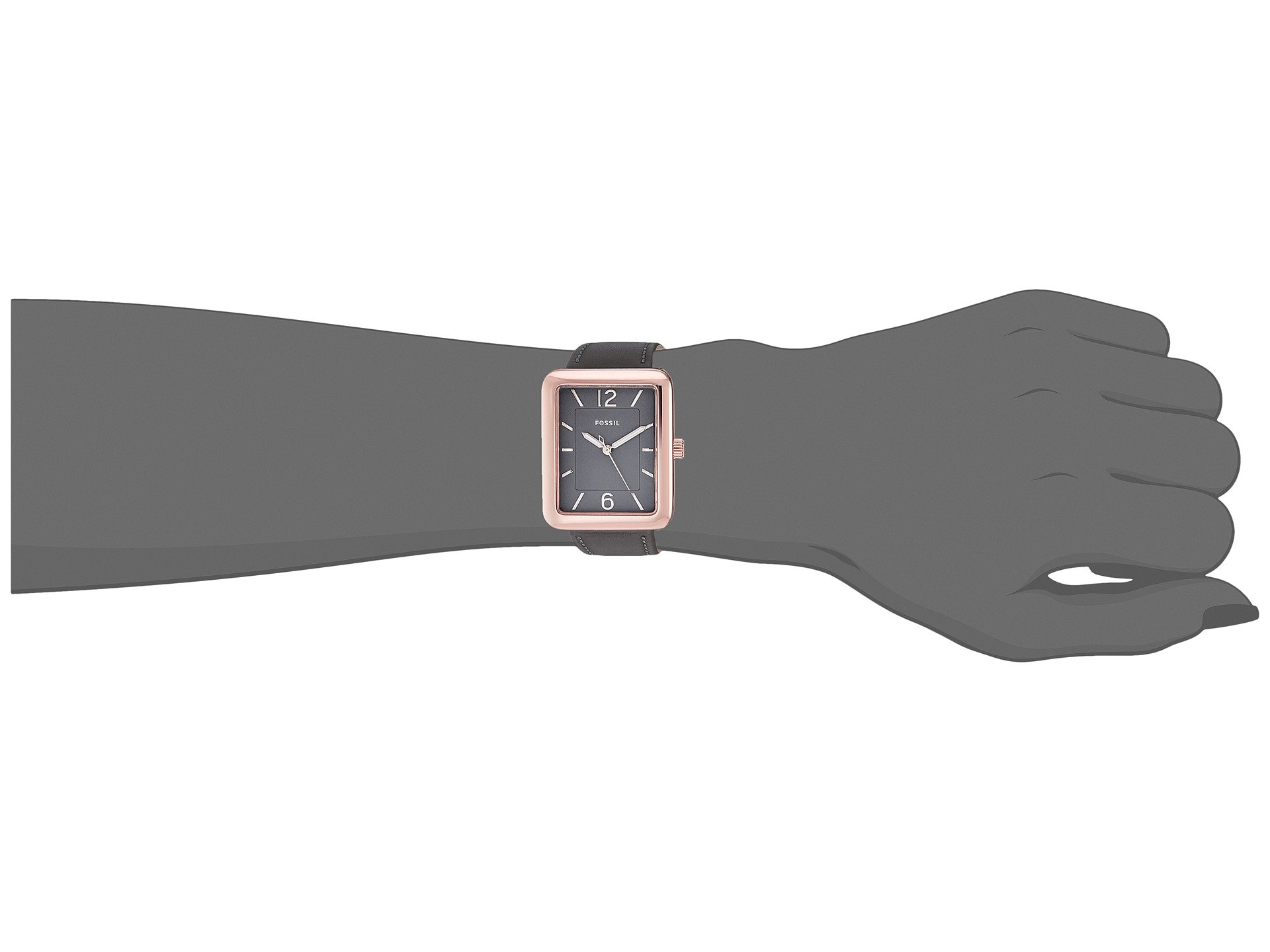 | Product Information SKU: #8931094Keep your look pristine with this watch from Fossil?!Stainless steel case.Leather strap with buckle closure.Tank face.Three-hand analog display with quartz movement.Grey dial features rose gold-tone hands, hour markers, and Fossil detailing.Water resistant 5 ATM.Display case included.Imported.This product may have a manufacturer's warranty. Please visit the manufacturer's website or contact us at warranty@support.zappos.com for full manufacturer warranty details.Measurements: Case Height: 28 mm Case Width: 28 mm Case Depth: 7 mm Band Width: 17 7?9 mm Band Circumference/Length: 8 1?4 in Weight: 1.4 oz |