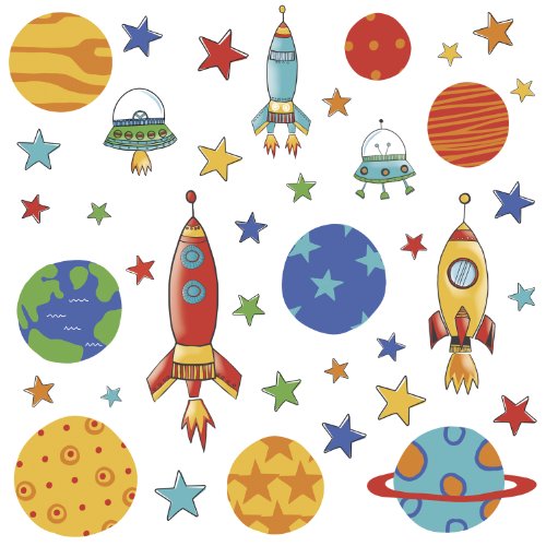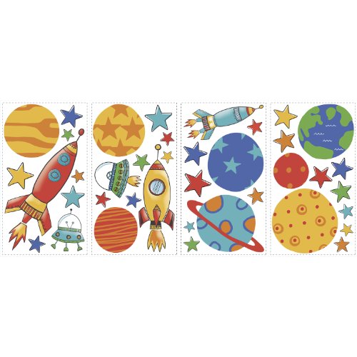 -. Binding : Kitchen -. Brand : York Wallcoverings -. Label : York Wallcoverings -. Manufacturer : York Wallcoverings -. MPN : RMK2618SCS -. PackageQuantity : 1 -. PartNumber : RMK2618SCS -. ProductGroup : Home -. ProductTypeName : HOME -. Publisher : York Wallcoverings -. Studio : York Wallcoverings -. Title : York Wallcoverings RMK2618SCS Planets and Rockets Peel and Stick Wall Decals, Take off into outer space with these Planets & Rockets wall decals. Great for a bedroom, nursery or any space, these removable and repositionable wall decals can be reused countless times. To install, slowly peel the wall decal from the backing and stick onto the desired surface. Features: Peel and stick: Stickers can be peeled away and re-applied easily, all without losing their sticky backing or leaving behind a residue Specifications: 39 Decals ranging in size from 1.5" Wide x 1.5" High to 5.75" Wide x 15.75" High All decals are packaged on 4 sheets