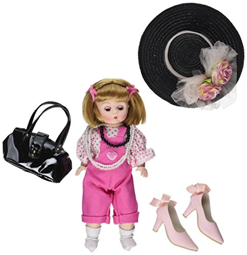 Dressed Up Like Mommy. She, an 8-inch fully-articulated Wendy, with blue eyes and short Tosca bob, wears pink bib overalls that features a heart applique on the bib. A pink polka dot blouse, with short sleeves trimmed with pink scalloped lace, is worn with the overalls, as is white anklets and oversized turquoise heels. A long strand of pearls wrapped twice around her neck, a matching iridescent necklace and bracelet and a black bead necklace add 'Mommy glamor' to her outfit. An oversized black straw hat that's trimmed with a tulle bow and pink roses along with an oversized black vinyl purse completes Wendy's adorable look when she decides she wants to be Dressed Up Like Mommy.Feature
