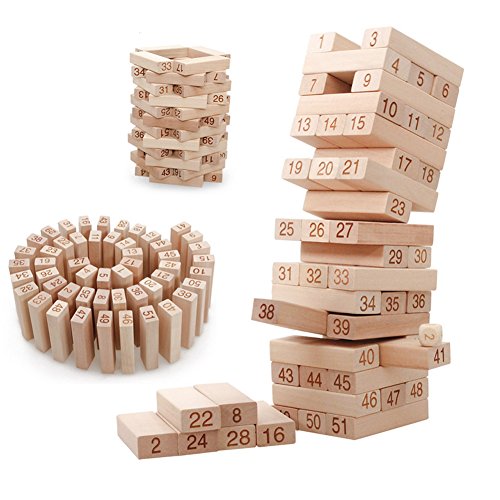 -. Feature : 54 pcs stacking blocks set with 4 dices, precision cut, smoothly polished, hardwood blocks with 1-54 numbers. And single block size: 7. 5*2. 5*1. 5cm/2. 9*0. 94*0. 55 inches / Play as normal wooden blocks, number blocks, dominos or any other game with your own rules. It can provide endless fun for a long time / Stacking games promotes friendship, communication and logic between players. Take turns rolling the dice, only using one hand to remove blocks helps hand-eye coordination and self-control. Hold your breath as you remove a block, slow, slow and slow, wait to see blocks fall down / Perfect for schools, party games, tailgating, camping, beach, park, special needs, birthday gifts, daycare, office fun, travel and so much more. Good family game, adults and children both will enjoy playing this game together. Suitable for 2 or more players / Not only can play blocks games, but also good math games as it P.R.Inted numbers 1-54 .Works with both upper extremities / hands / fingers as well as the brain. Recommended for ages 3 years old and plus, approved ASTM and CPSIA test, safe for kids