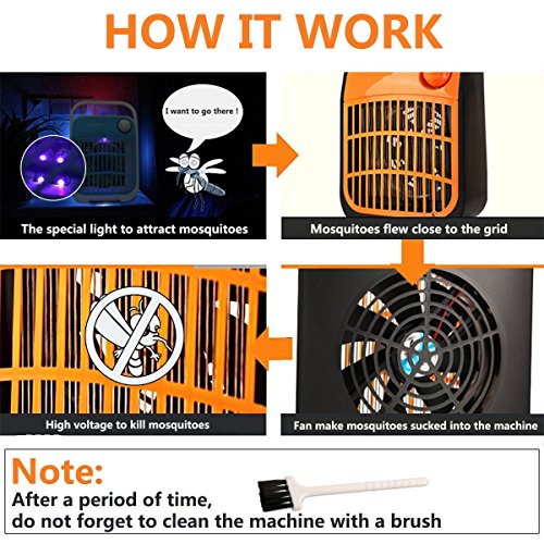 -. Feature : IGH EFFICIENCY - Mosquito Killer attracts more mosquitos, flies, moths and other flying pests around to close to the light source. When they fly close to the light source, the airflow produced by fan will inhale flying pests quickly into power grid, and then INSTANTLY electrocuted to death. Effective area 50 square meters. / SAFETY & DURABLE - No smell. No poisons. No harmful chemicals. UV lamp light decompose harmful gases and kill bacteria. We use only high quality materials, so you're Insect Trap will work efficiency. / EASY USE & CLEAN UP - No more smelly, messy sprays. Simply plug it into a standard outlet and all nearby flying and crawling insects will be attracted to it. Just open the net and remove the mosquito residue with a cleaning brush! / ENVIRONMENT PROTECTION: Soft UV lamp makes it energy saving and durable. Low power consumption and Low carbon. Efficiency & Economically! / THE BEST DEAL WITH 100% RISK-FREE SATISFACTION - We offer you a 30-Days Money Back Guarantee to let you buy with confidence; no questions asked. However, we are quite confident that you won't find a better deal!