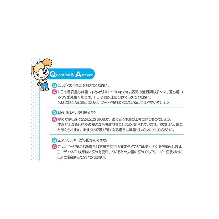 <콜 디G를 줄 때의 주의점> 콜 디G는 혈유촉진 효과가 높게 체온 상승에 따라 호흡이 일러지는 경우가 있습니다.그 때문에 처음은 귀이개1-2잔분의 소량부터 줘 비로소 문제가 없으면 서서히 표준량에 증량해 하십시오.